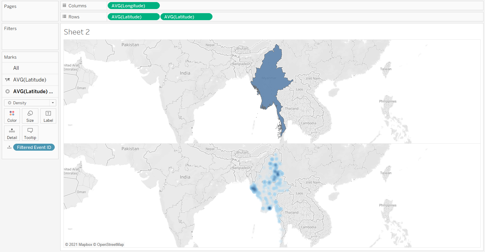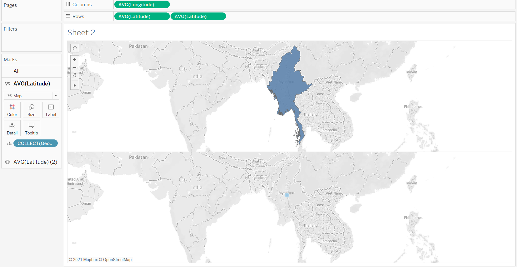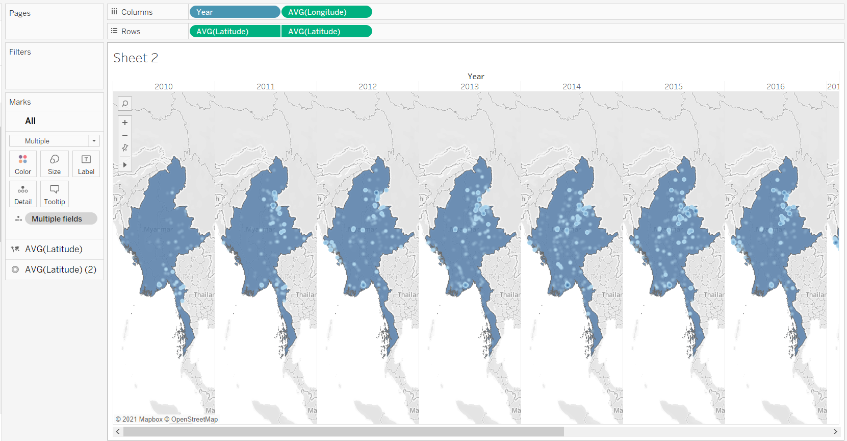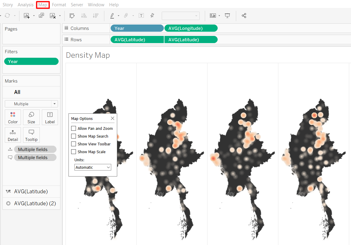 Do not use the default map background from Tableau but use the shp file for Myanmar to provide the map background (2).