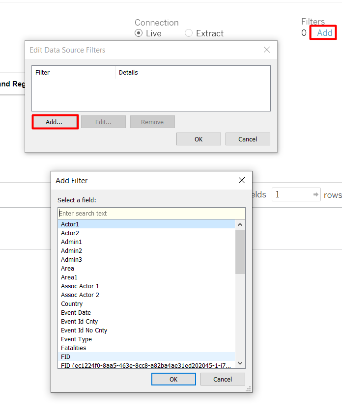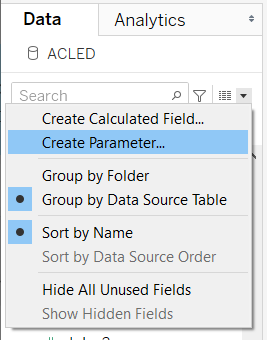 To create calculated fields, click the grey triangle beside the search bar like if you are going to create a parameter > Create Calculated Field… Make sure that the ACLED Data Source is selected.