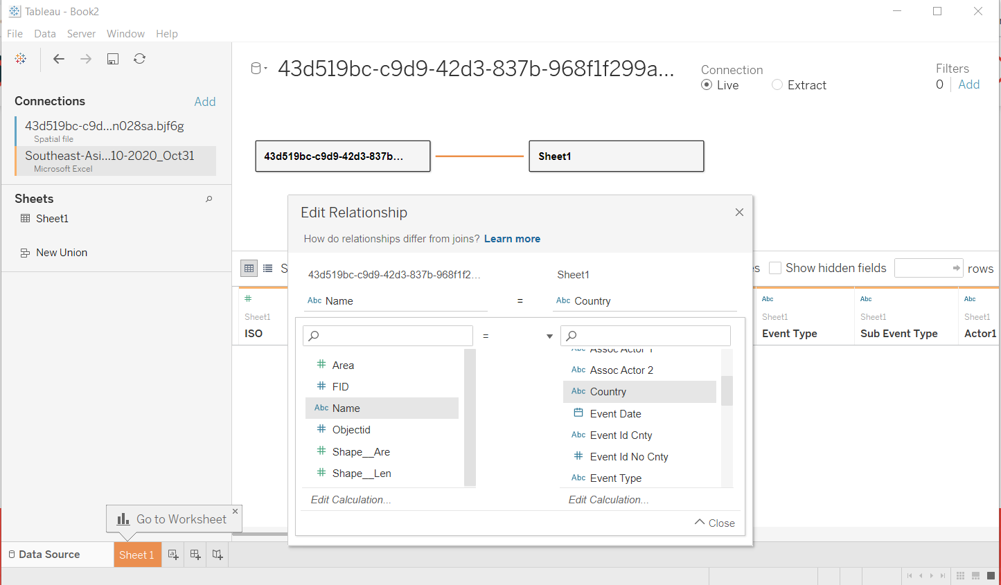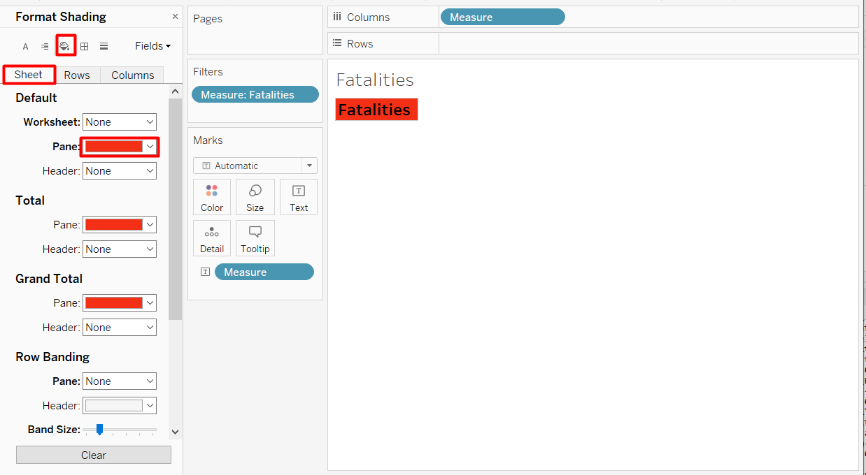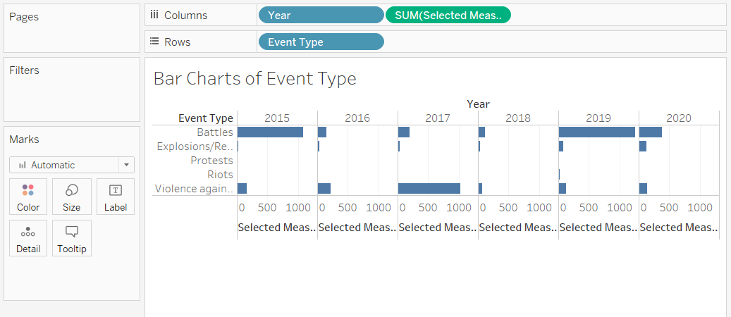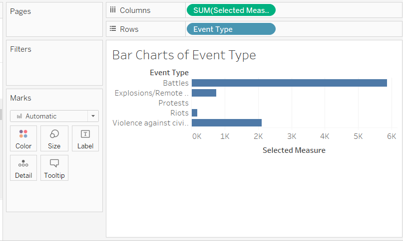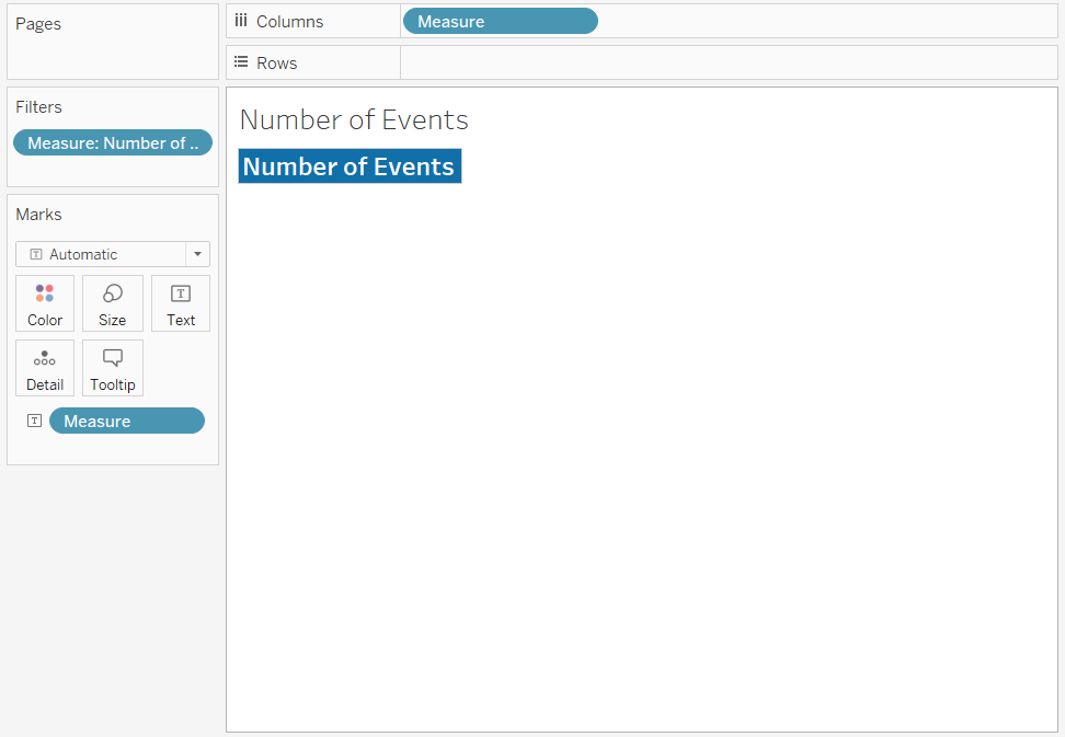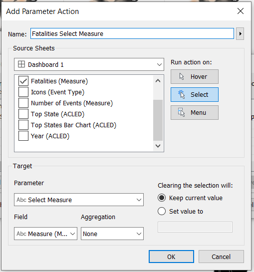 Repeat again for Number of Events, keeping all the properties for Fatalities Select Measure action except changing the source sheets to Number of Events only.