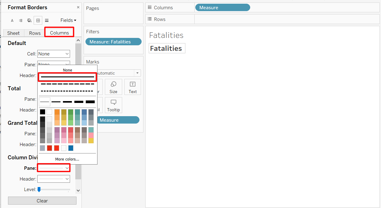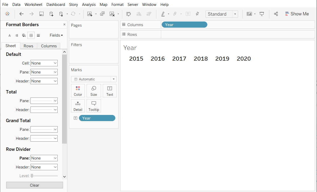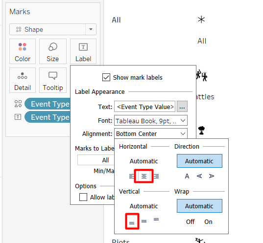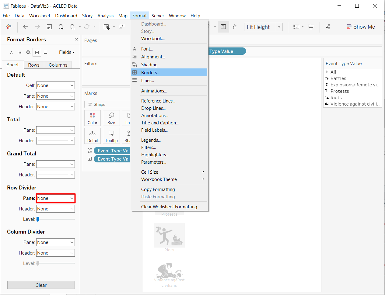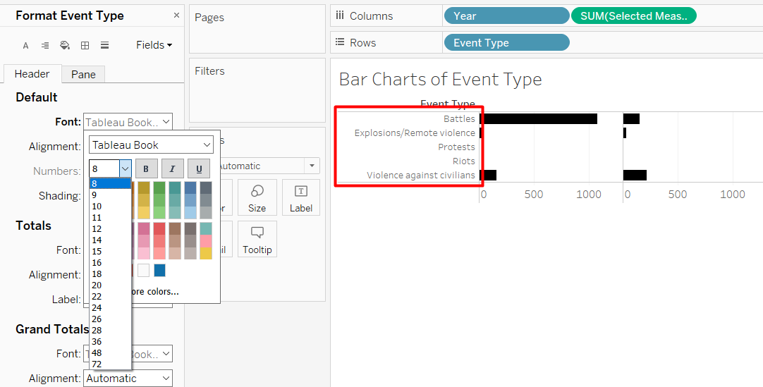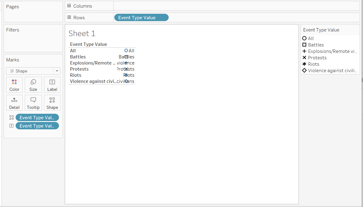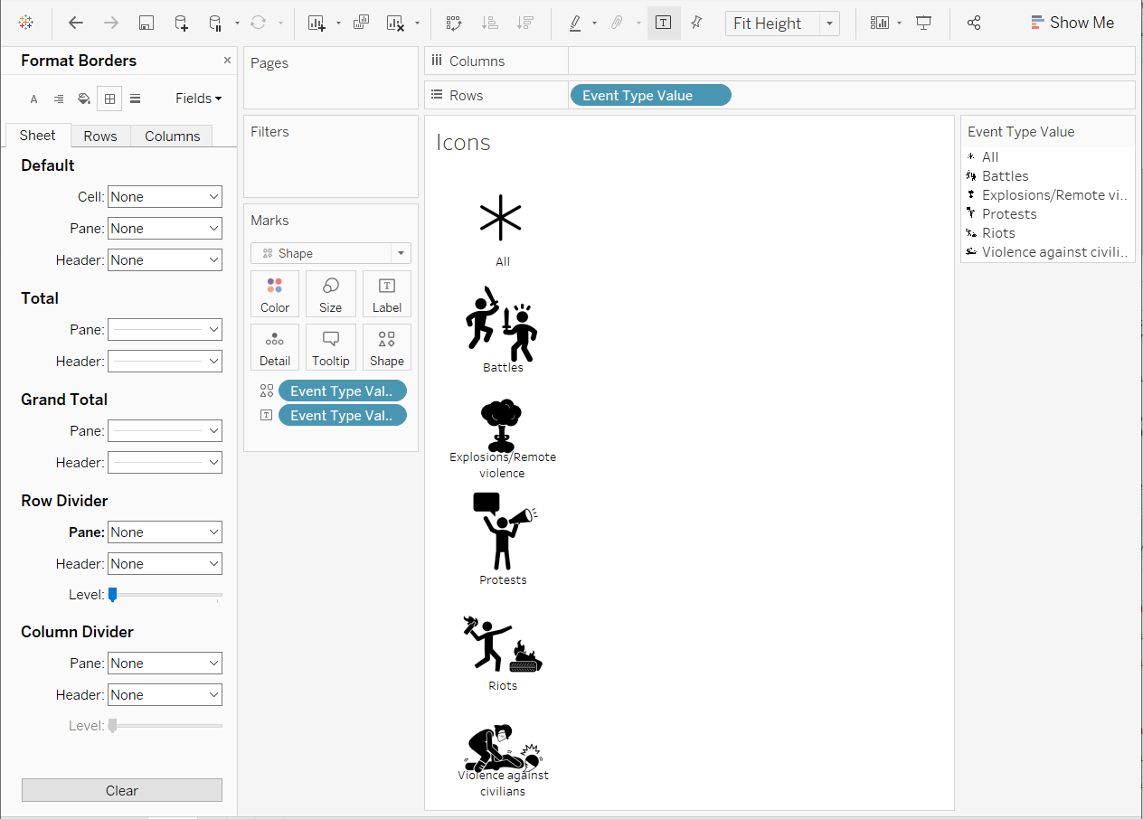 Unshow the header by right-clicking on the Event Type Value pill in the Rows Shelf > Uncheck Show Header. We do not need it anymore because we already have the label.