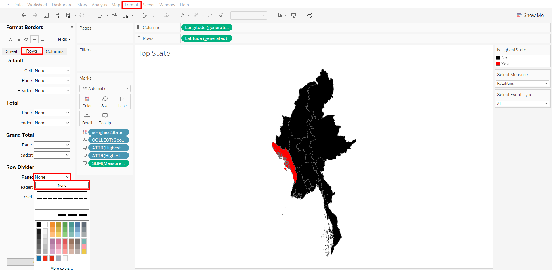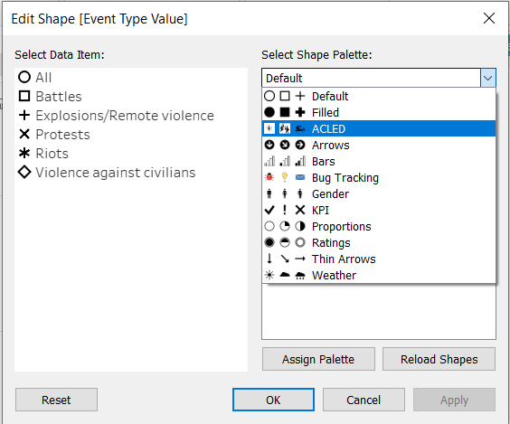 If the state that is being highlighted is different, it might be due to the different parameters being selected. The parameters that were selected on this screenshot is Fatalities of Protest event type. If we want to change it, we can right-click on the parameters on the Data Pane > Show Parameter.