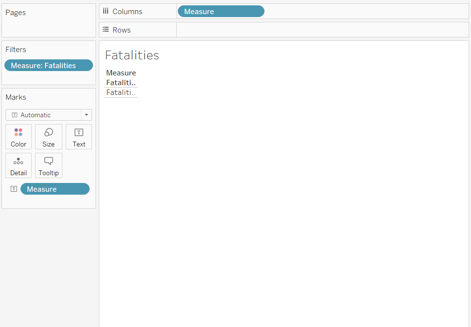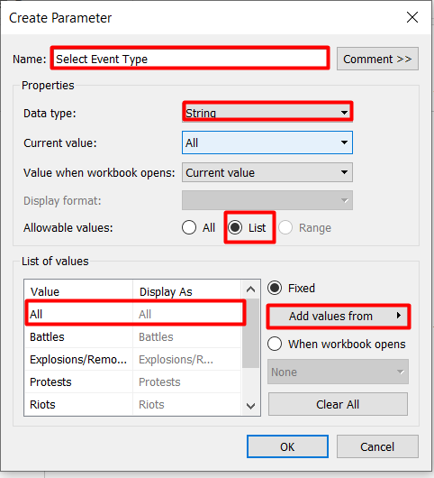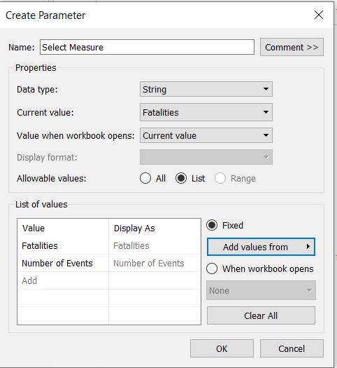 Repeat the steps to create parameter shown in section 4.1 for a parameter called Select Measure. The values in the Excel file are “Fatalities” and “Number of Events.”