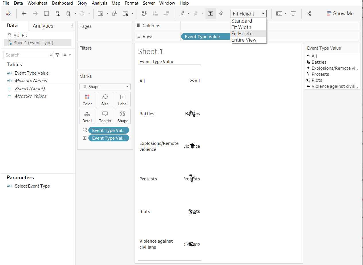 We have 3 sheets in the dashboard that is meant to be used as a filter: Icons, Fatalities, and Number of Events. We can change the value of parameters according to actions performed on these sheet.
