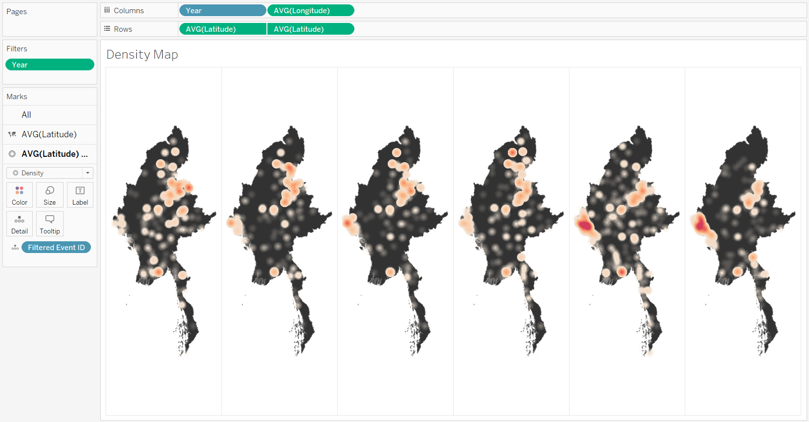 Due to the problem of the overlapping points (Clarity #1), I have decided to use another way to represent the spatial data. Initially, I thought of using a proportional symbol map with lower opacity to better represent the data, as the overlapping points will contribute to the size of the symbol. However, this method requires aggregation, and there is a problem in the mapping of the geographical data. There were hundreds of unrecognized location from the Admin 3 attribute (The third largest sub-national administrative region in which the event took place (Event Data Project (ACLED) 2019)). Aggregating on the higher level would not solve the issue. Even though the number of unrecognized location would be manageable to resolve manually, but the map will be less meaningful because it is too aggregated. Therefore, as shown in number 2 in Figure 7, I have decided to create density maps to represent the data instead.