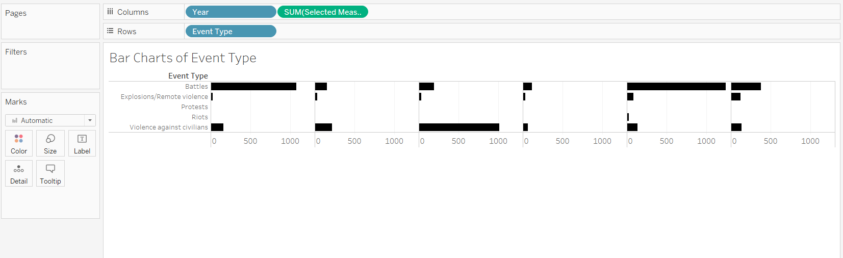 The bar chart is broken down by year in the trellis (3). This would make is easier for the user to compare the values between event types, even though it might be difficult to compare different years. However, by standardizing the axes for the values, the user can still compare the height of the bars in different years when the difference is big.