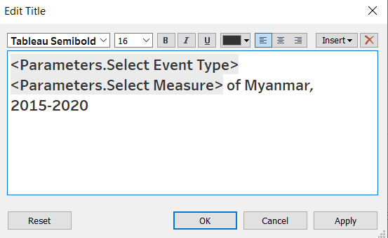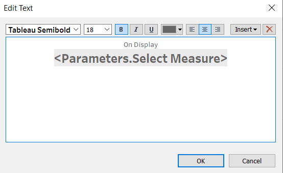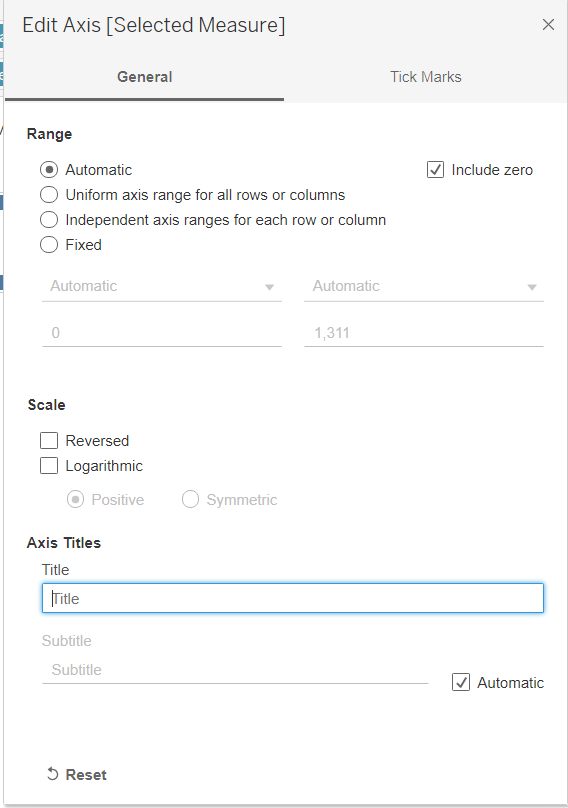 Rather than repeating all the y-axis label for each cell, we will create a dynamic text to show what measure is being displayed later. * Double-click on the “Selected Measure” axis label * Delete the Title and leave it empty