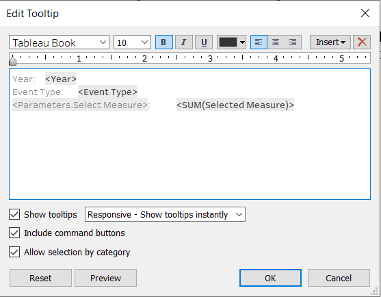 We need more calculated fields to enable the interactive functions to select the measure to be displayed, whether it is the number of events or the number of fatalities. The name of the calculated fields and the formulas are listed below.