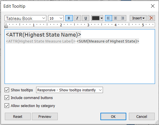 We are going to create two more calculated fields just for the tooltip. We will return a value for the highest state but return NULL for the rest. This is to prevent the tooltip from showing if the user hovers over the other states.