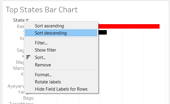 Next, we are going to use the existing calculated fields to create a bar chart that displays the top 10 states in descending order by the values selected in the parameter.