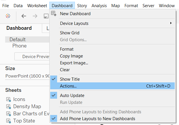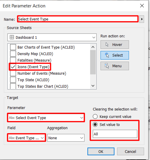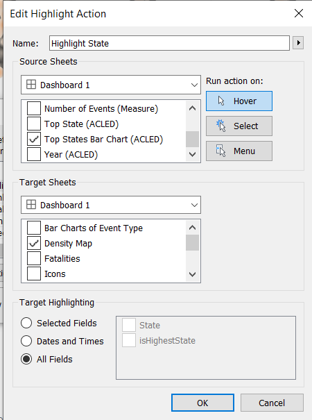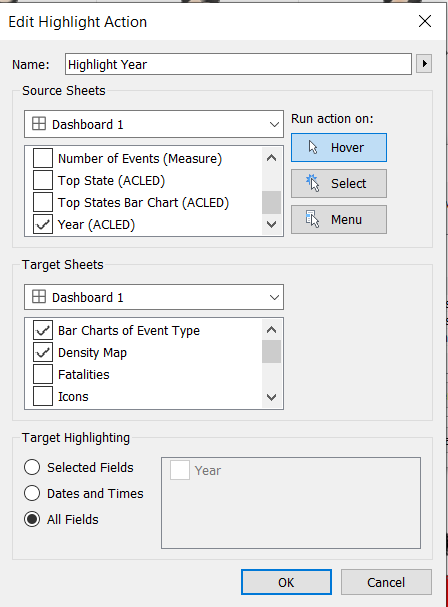 We will use the year as a highlighter, but we will use hover action instead of select. * Click Dashboard menu > Actions… > Add Action > Highlight … * Set the Action as hover and source sheet as Year. * Only keep Bar Charts of Event Type and Density Map as the target sheet.