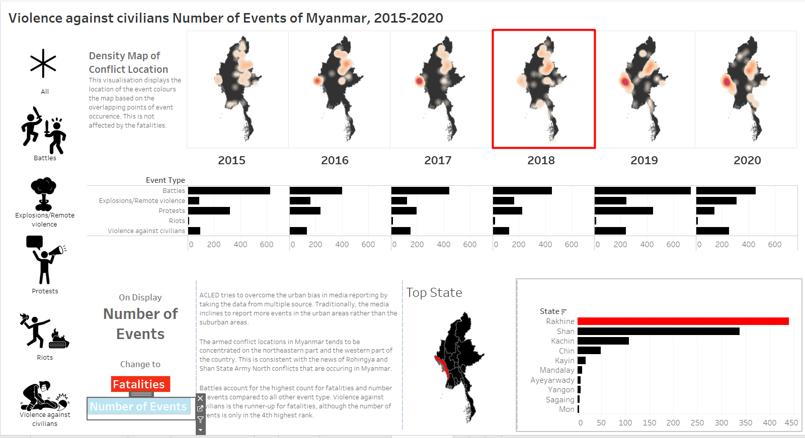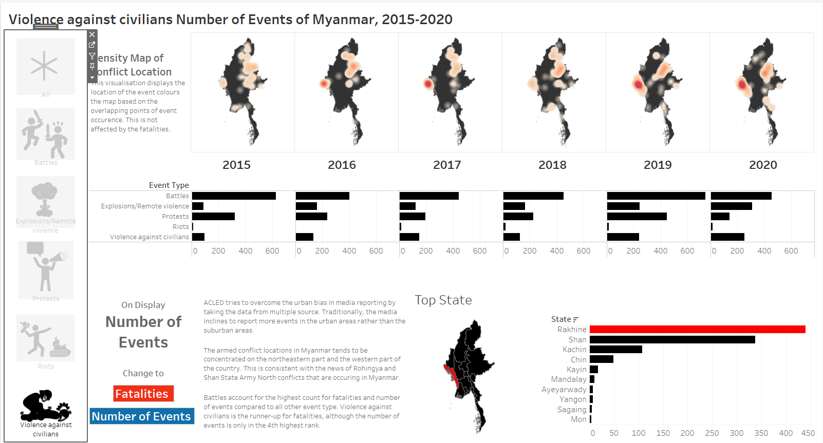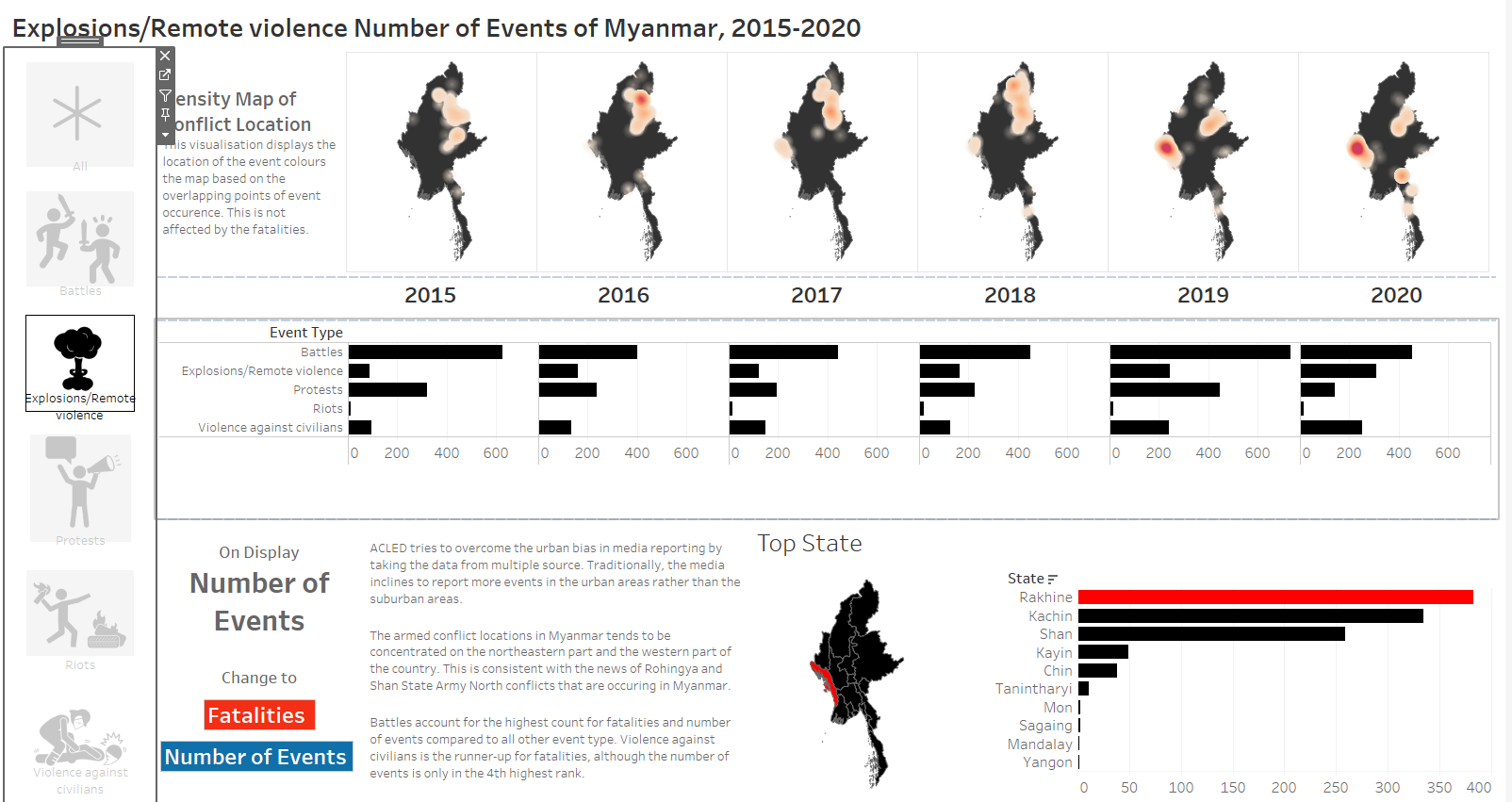 The original visualisation is the South East Asia Armed Conflict Analysis that is hosted in Tableau Public. It reveals the spatio-temporal patterns of armed conflict in selcted South East Asian countries between 2015 and 2020 by using a one-to-one dot-density map where each dot represent an actual event (“Dot Density Maps” 2020), with different colours used for each type of events.