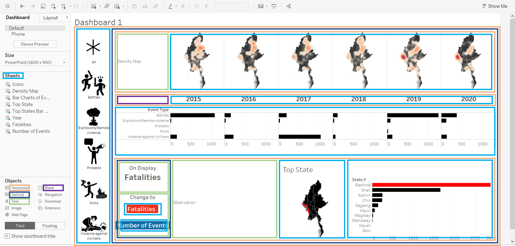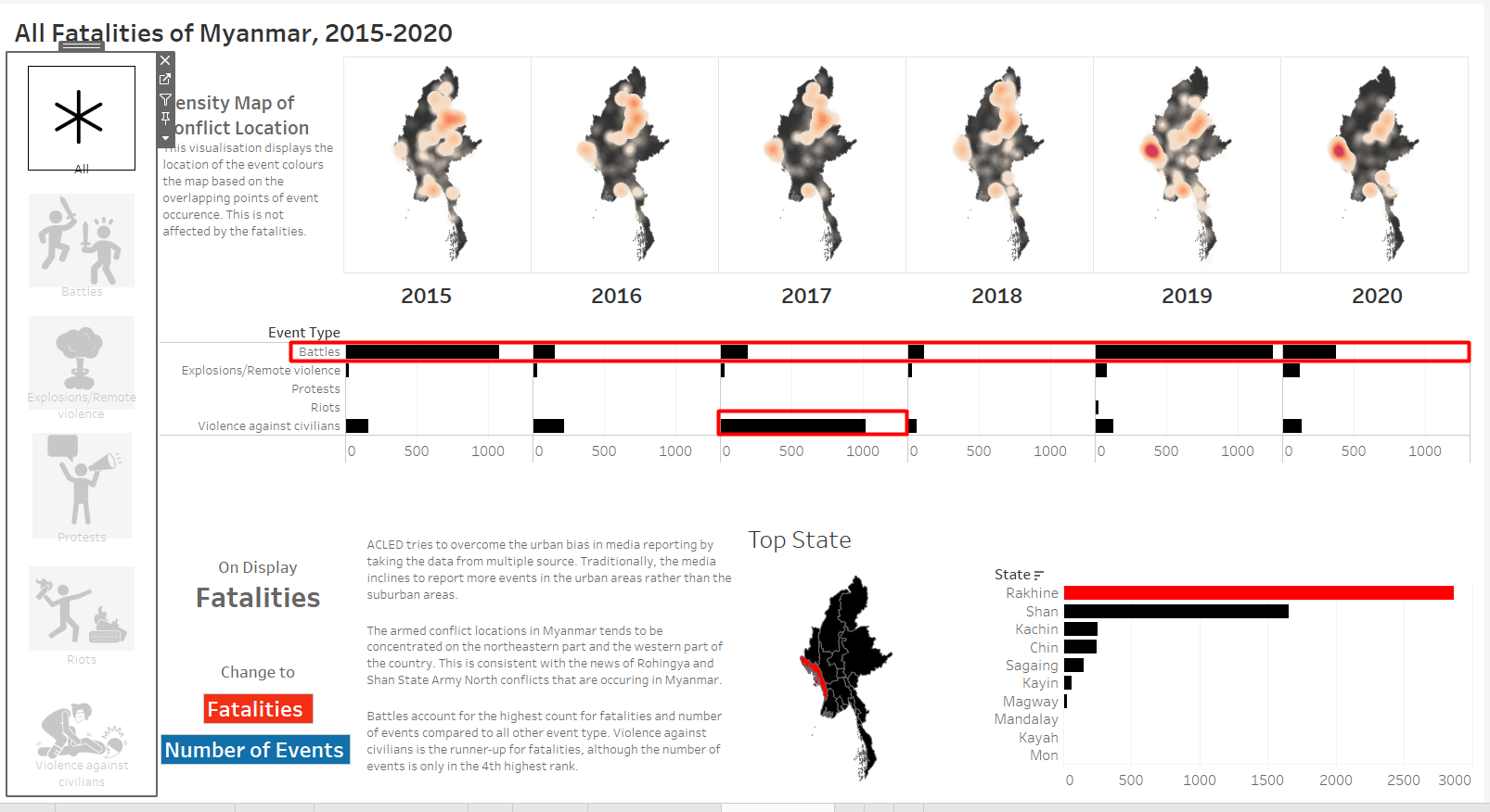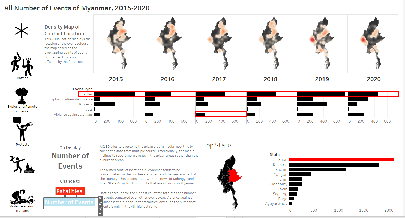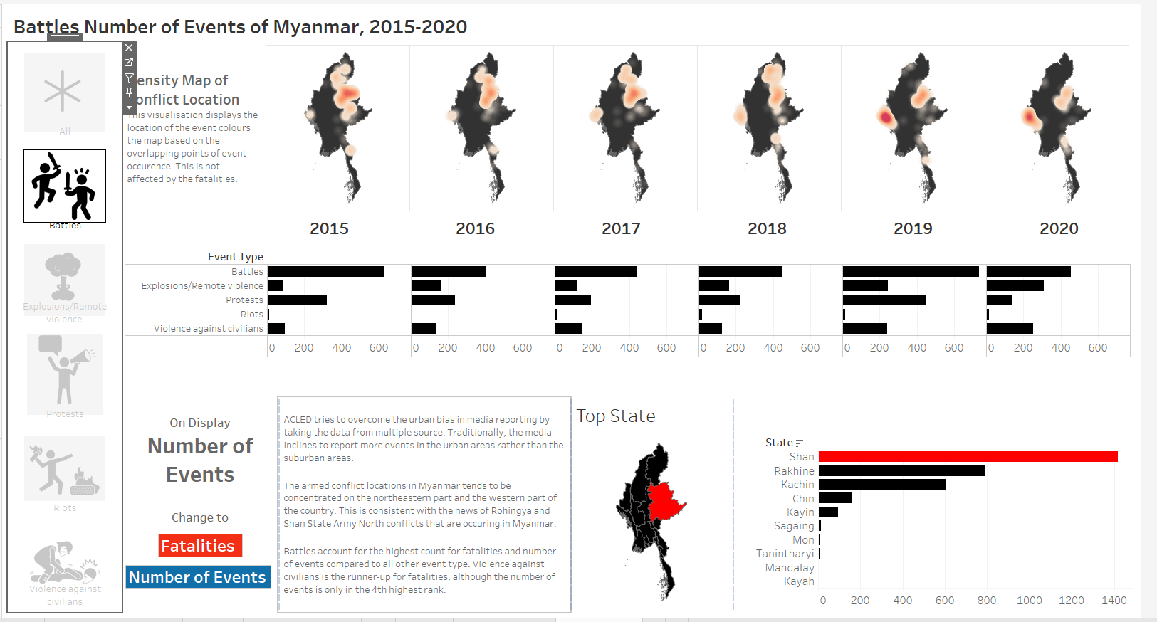 The original visualisation is the South East Asia Armed Conflict Analysis that is hosted in Tableau Public. It reveals the spatio-temporal patterns of armed conflict in selcted South East Asian countries between 2015 and 2020 by using a one-to-one dot-density map where each dot represent an actual event (“Dot Density Maps” 2020), with different colours used for each type of events.