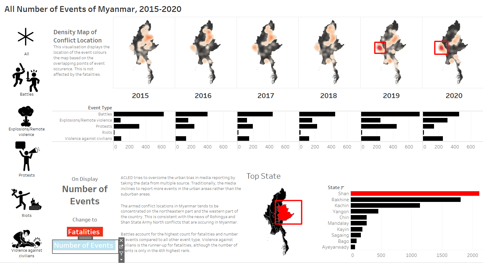 The total number of events are highest in Shan, with more concentration on the western part of Myanmar on 2019 and 2020.