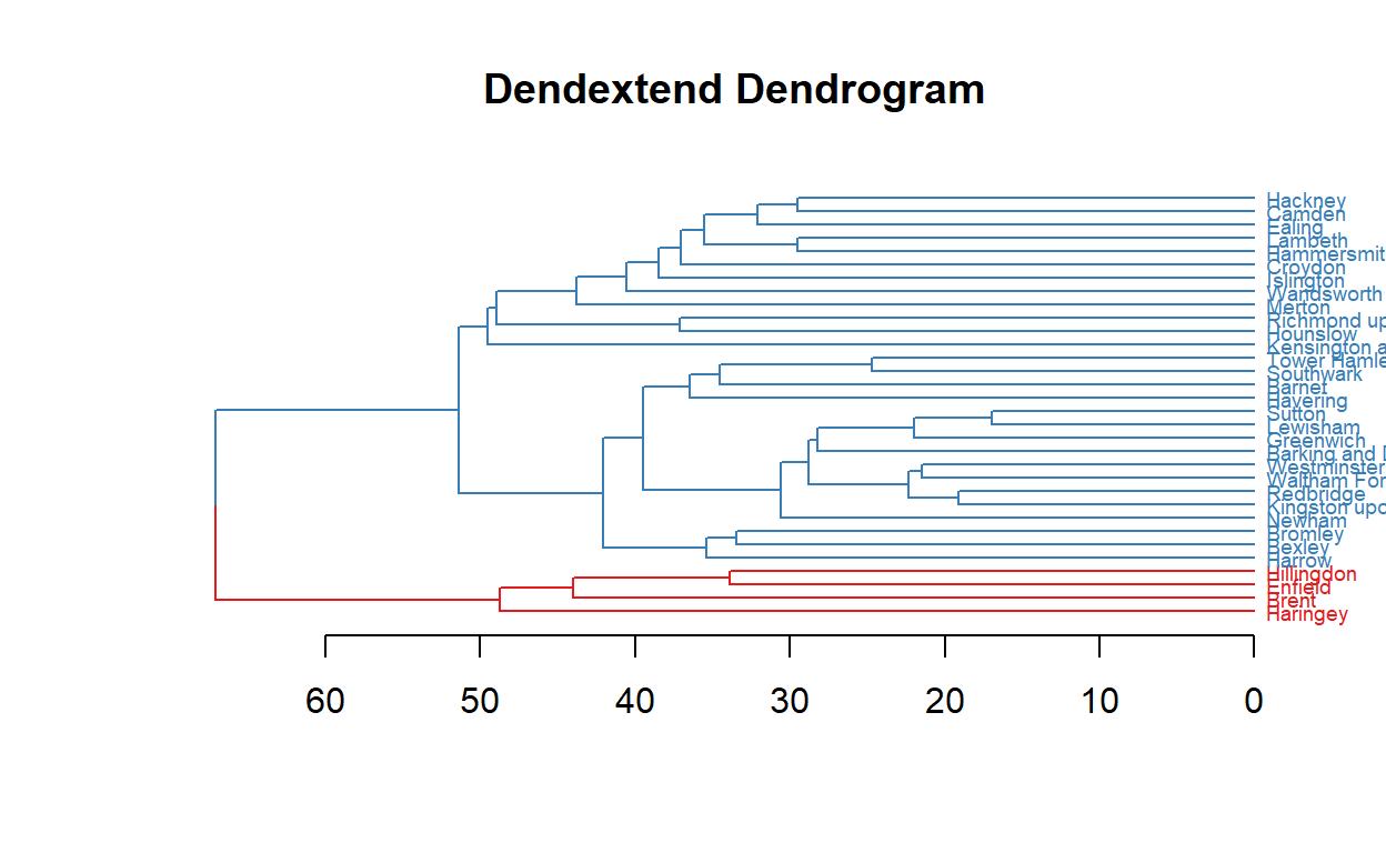 There is a new problem with this visualisation, because now the labels are not aligned properly. Using dendextend’s as.ggdend() function still yields a better result.